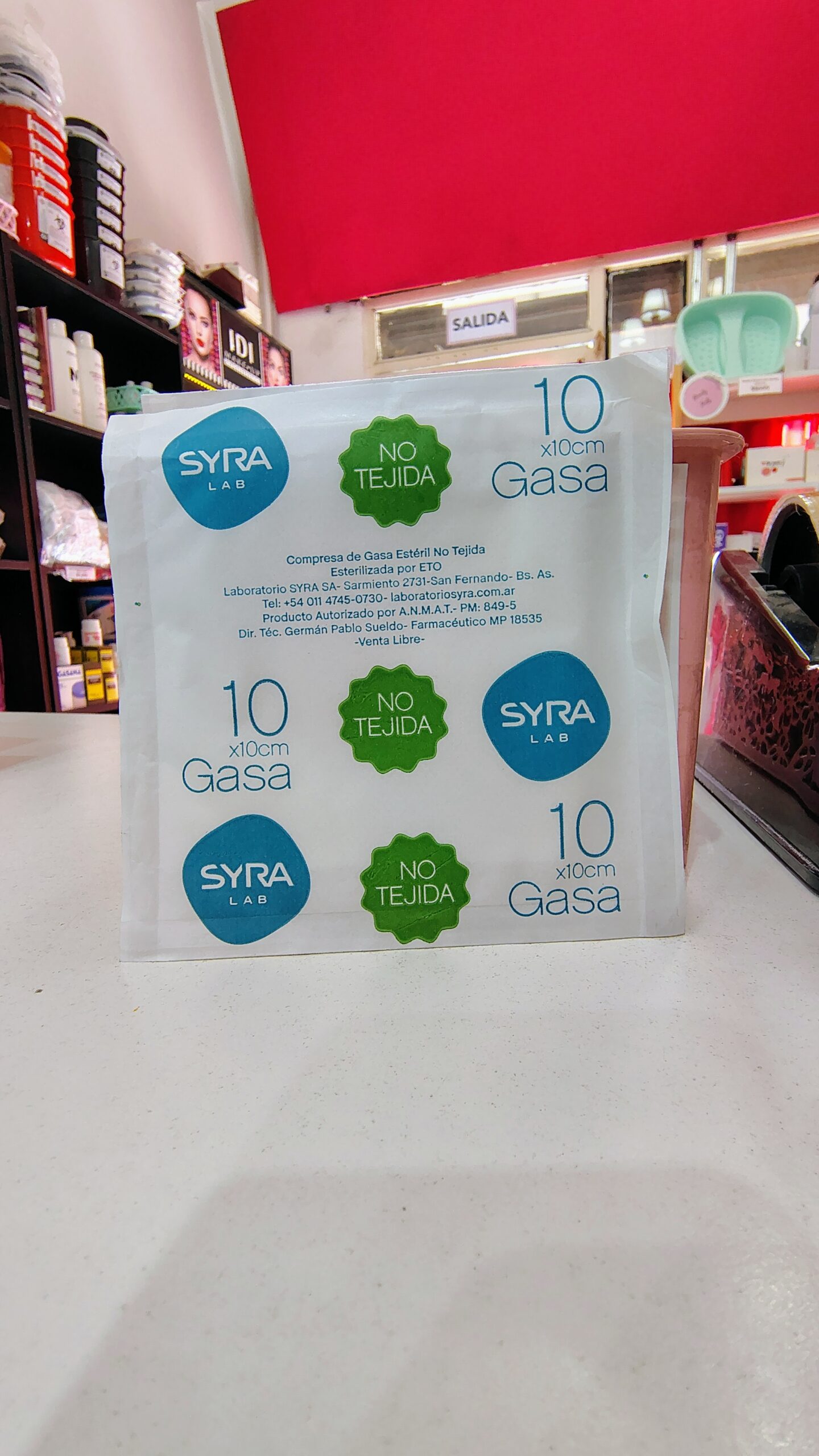 Gasa no tejida suave y levemente elastica, la marca puede variar hay Gasana de 7.5 x 7.5 cm y Syra 10 x 10 cm